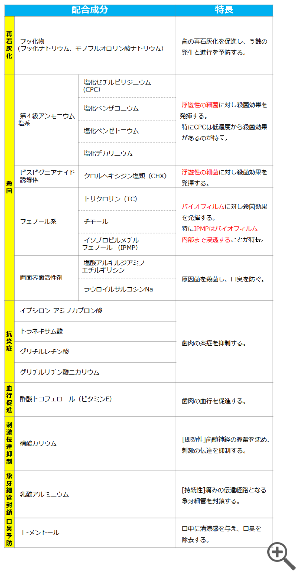 歯磨剤・洗口液などに使われる代表的な配合成分の一覧
