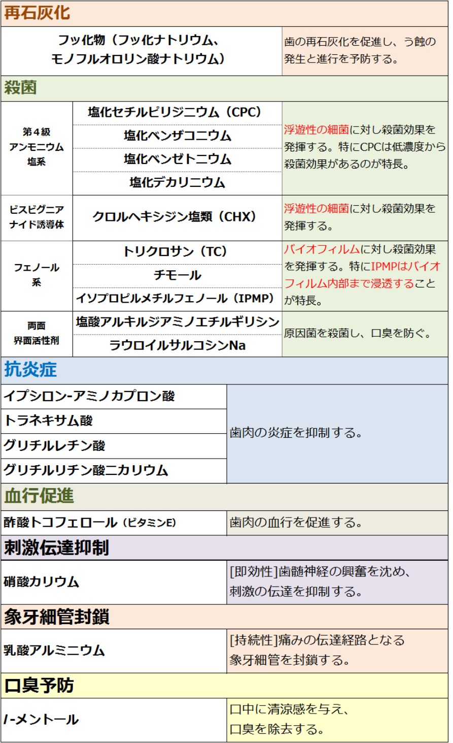 今回まとめた成分は歯磨剤・洗口液では頻出の成分です。特に殺菌剤の違いは必ず押さえておくようにしましょう。